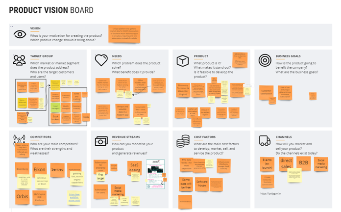 The user story map organizes the main actions users take on the platform, including onboarding, managing payments, searching, analyzing, and exporting data, all the way to messaging and feedback. It details user goals and interaction flows, from signing up and viewing demo products to customizing dashboards and comparing reports.
